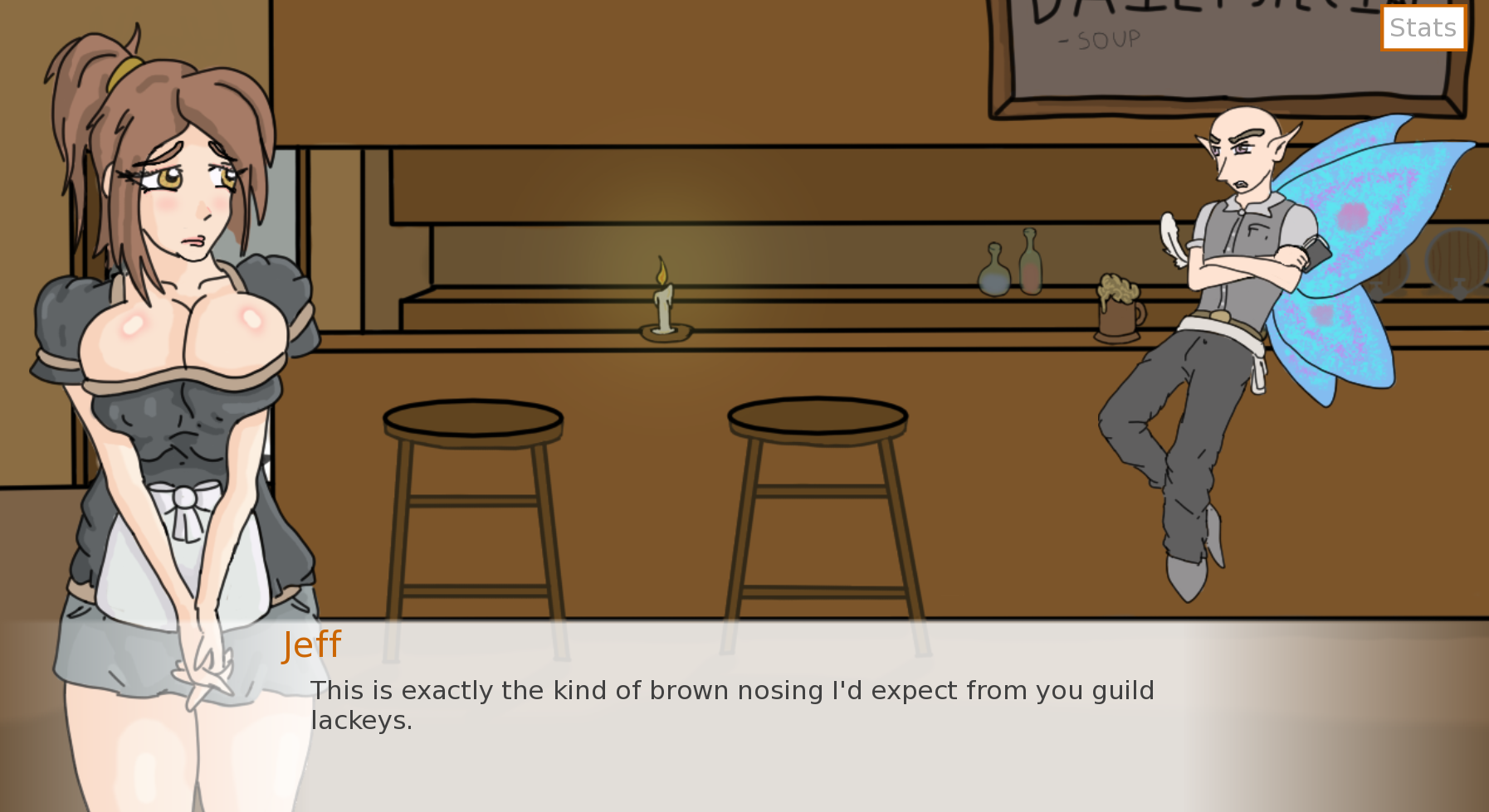 Wench Quest предлагается вам xGames в списке игр для взрослых. Бесплатный доступ к этой игре предоставляется всего в несколько кликов. xGames ежедневно доставляет вам все новые игры.Даллию отправляют в маленький приграничный городок Оринсбург, чтобы она разбогатела в качестве девицы, ведь самые большие чаевые дают искатели приключений! Сможет ли она завести новых друзей и вписаться, и сможет ли она распутать интригу в пабе «Вонючий гоблин»?